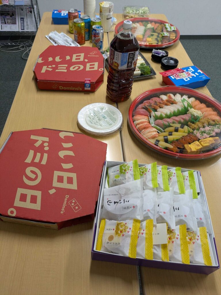 お寿司にピザにお酒に社員が持ってきた差し入れなどを各テーブルに並べて全社員の8割くらいが参加しました